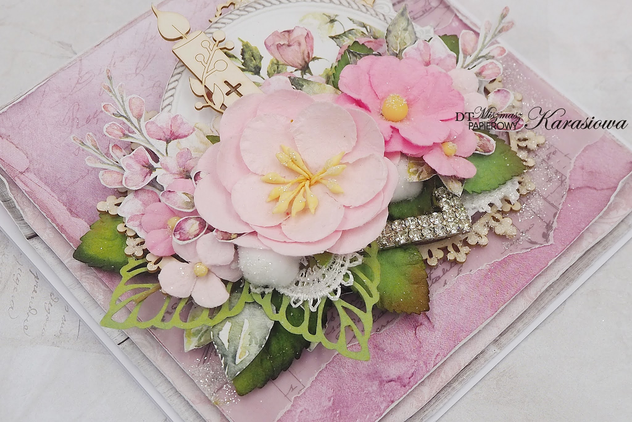 U mnie dzisiaj karka na Chrzest, w odcieniach różu, z kompozycją kwiatową, cudnymi tekturkami, brokatem i biżuterią.