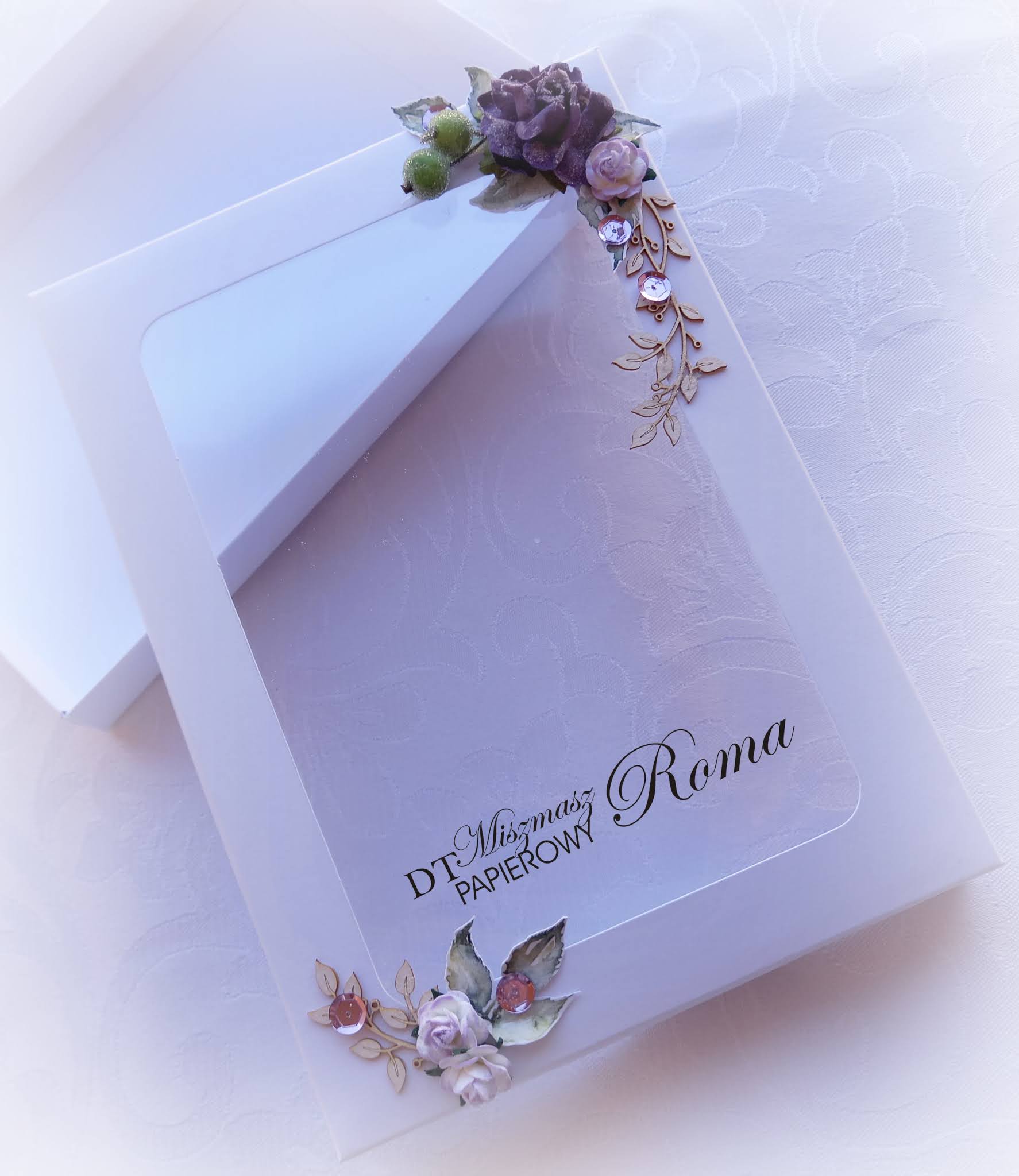 Powierzchnia duża i trzeba sporo detali by ją zapełnić. Lubię kiedy kartka ma sporo warstw i sporo kwiecia. Kompozycję kwiatową uzupełniłam tekturkami z motywami roślinnymi, czyli tzw. zapychajkami. Zazwyczaj dzielę te tekturki na części i upycham gdzie się da.