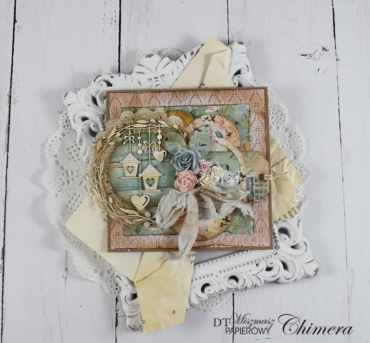 Sezon ślubny w pełni, więc dzisiaj chciałabym Wam pokazać kartkę na ślub, którą ostatnio stworzyłam. Kolory, które wybrałam to róż i błękit, a ozdobiłam ją papierowymi kwiatami, wstążką oraz niezwykle uroczą tekturką - Wianuszkiem laurowym z budkami i serduszkami. Całość prezentuje się tak: