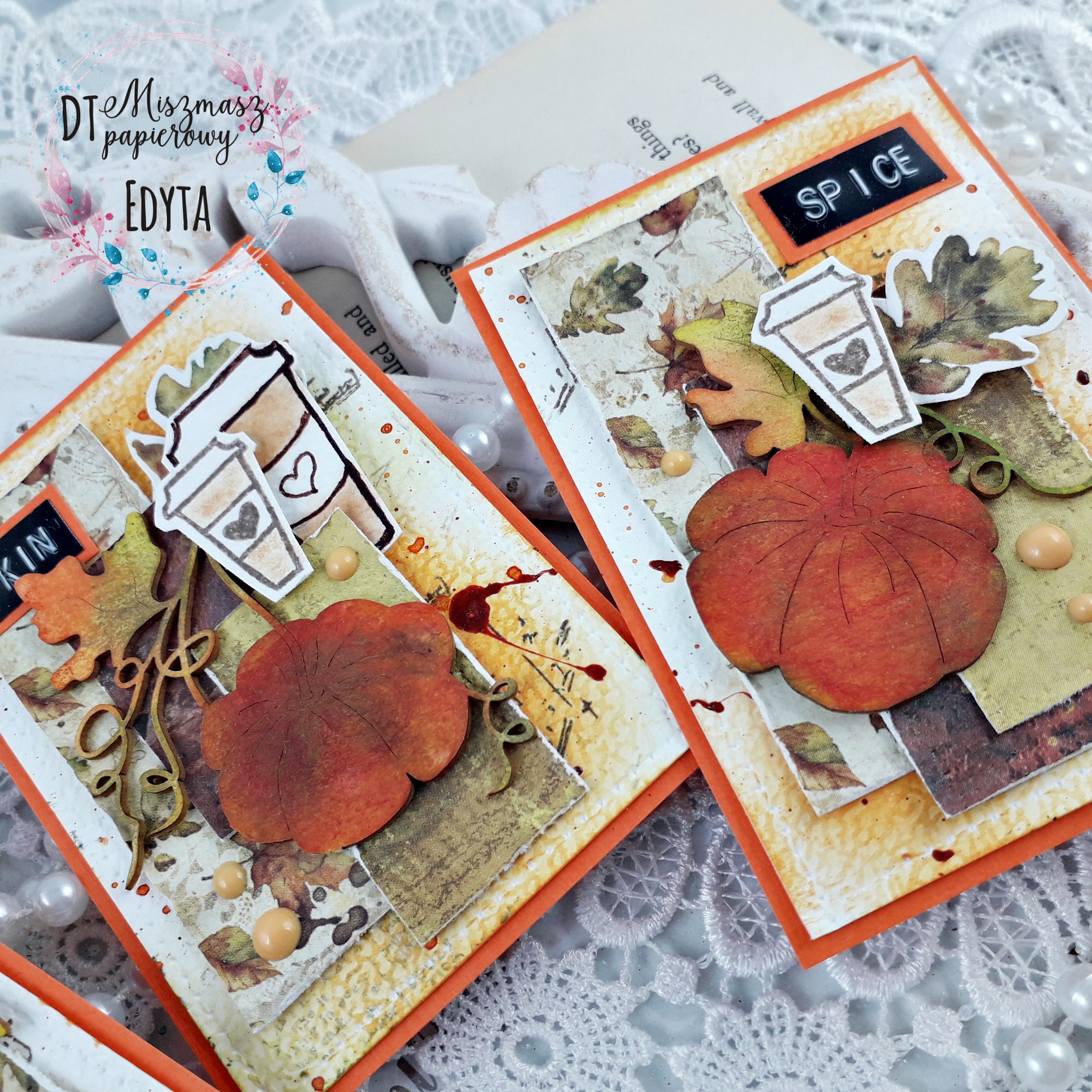 Witajcie, oto ostatni z jesiennych projektów w tym roku. Powszechnie do łask powracają karty ATC, dlatego i ja postanowiłam wykonać sobie komplecik w jesiennym klimacie, używając fantastycznych tekturek dyni od Miszmasza Papierowego. Może ktoś zechce się wymienić?